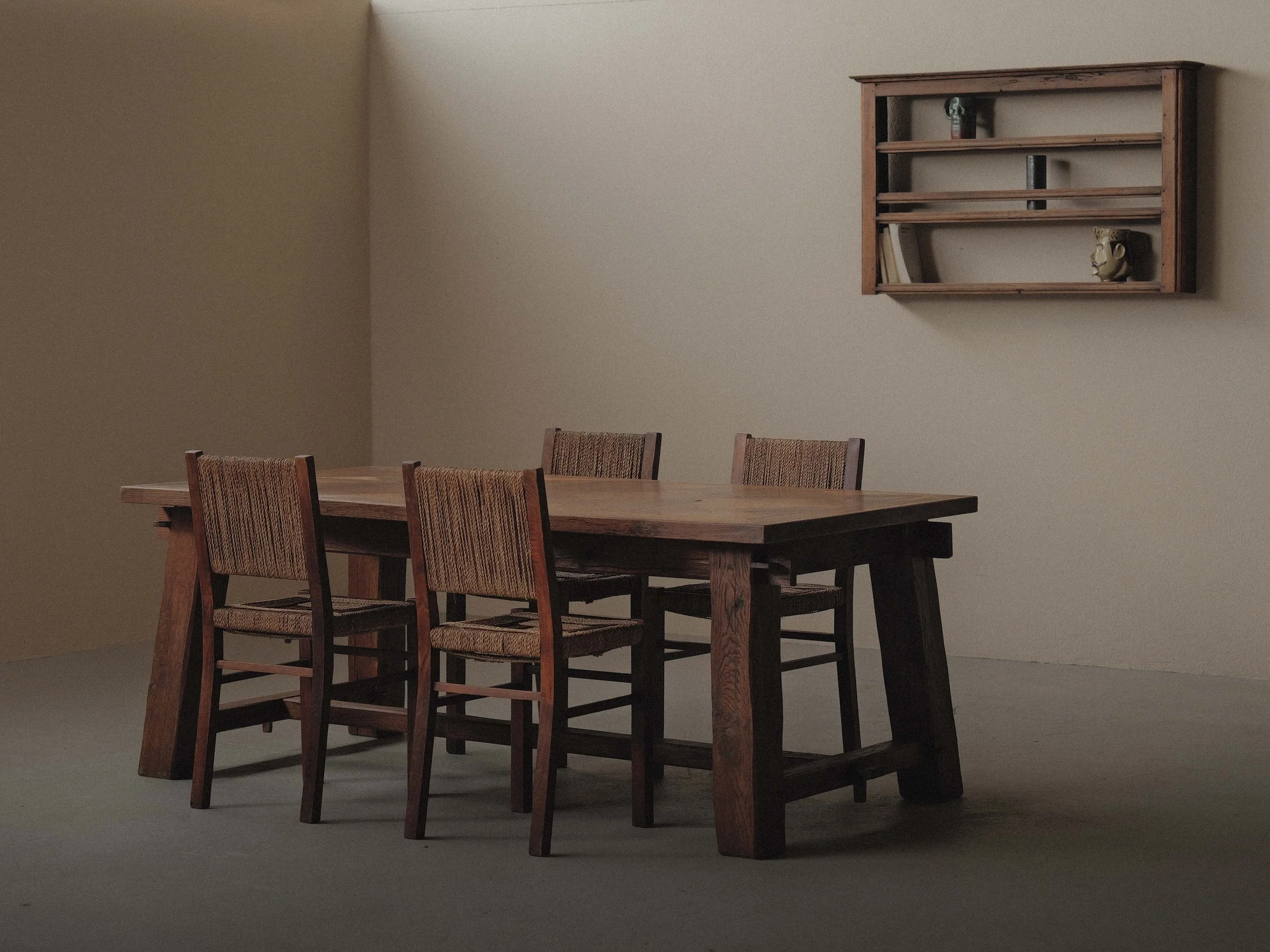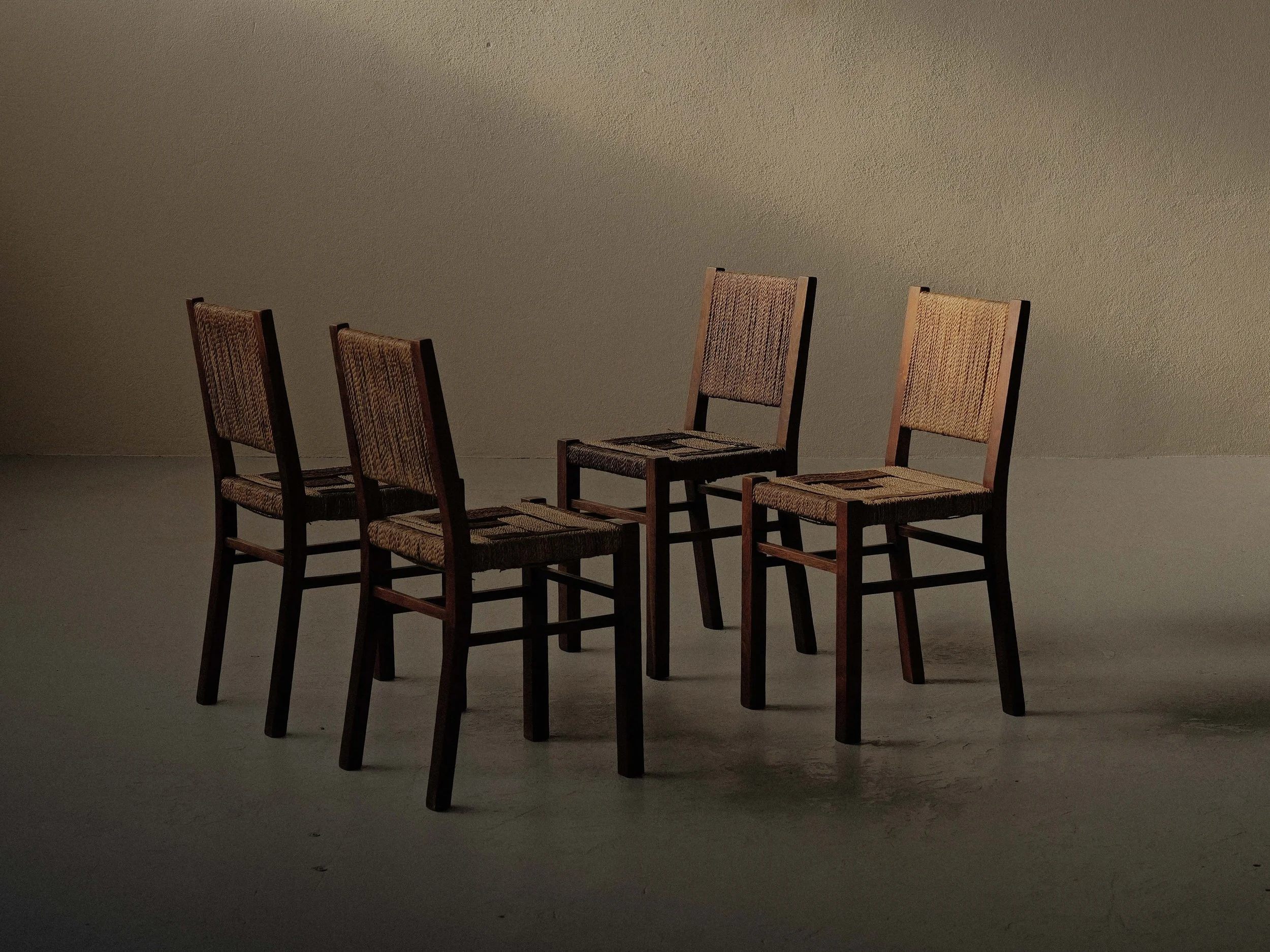 Ensemble de quatre chaises modernistes des années 1950, réalisé en bois massif avec assises et dossiers en corde tressée. Leur silhouette épurée, structurée par des lignes droites et une construction robuste, illustre l’esthétique fonctionnaliste d’après-guerre.